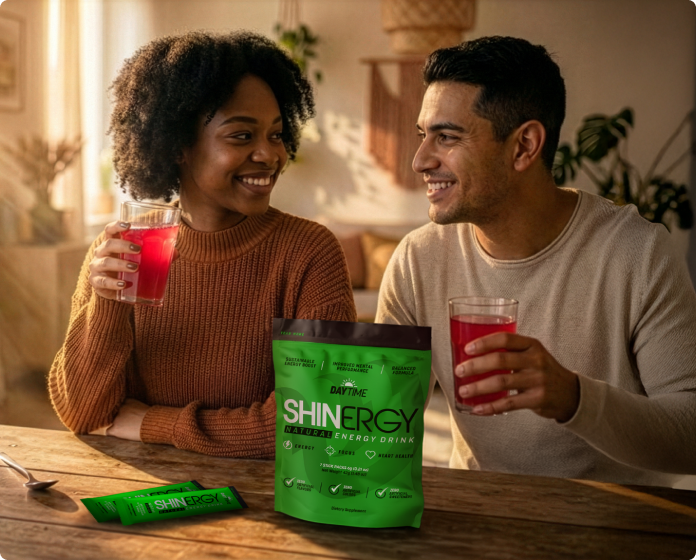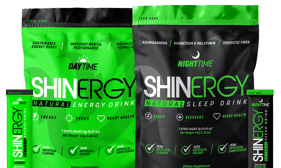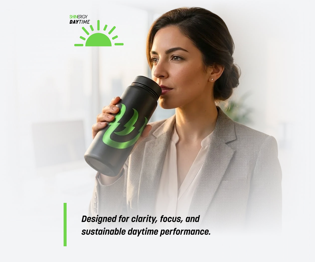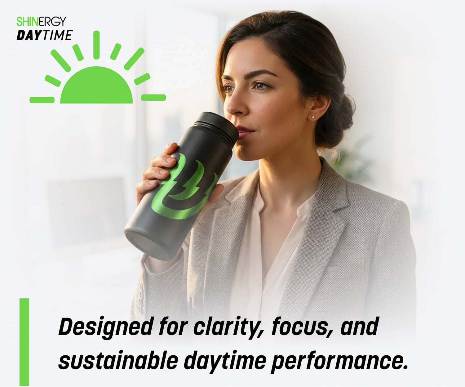 Shinergy Day uses 75 mg of natural caffeine from green tea—not synthetic stimulants—paired with thoughtfully selected nutrients that support focus and sustained energy.